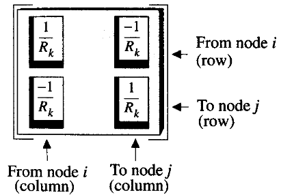 For a resistor connecting from node \(i\) to node \(j\), it will give the matrix stamps in \(Y\) matrix.